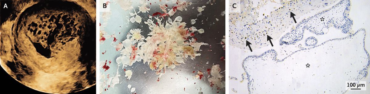 A 32-year-old woman who had a history of two pregnancies and deliveries presented to the gynecology clinic with a 20-day history of vaginal bleeding. Ten weeks before presentation, amenorrhea had developed, and a home pregnancy test had been positive 2 weeks before presentation. On physical examination, the fundal height was consistent with a pregnancy at 12 weeks’ gestation. The serum human chorionic gonadotropin (hCG) level was 222,634 IU per liter (reference value, <5). Transvaginal ultrasonography showed an intrauterine mass with numerous cystic spaces that created a “snowstorm” pattern (Panel A). Owing to concern about a hydatidiform mole, dilation and curettage was performed. Diffusely hydropic chorionic villi without any associated fetal parts were removed from the uterus (Panel B). Immunohistochemical analysis of a histopathological specimen showed expression of p57 — a maternally expressed gene product — in uterine tissue (Panel C, arrows) but not in the villi (asterisks). This finding confirmed the diagnosis of a complete hydatidiform mole, a type of gestational trophoblastic disease that results from an aberrant fertilization in which all chromosomes are paternal. Six weeks after surgery, the patient was doing well. The hCG level was undetectable at that time and remained so 1 year later.