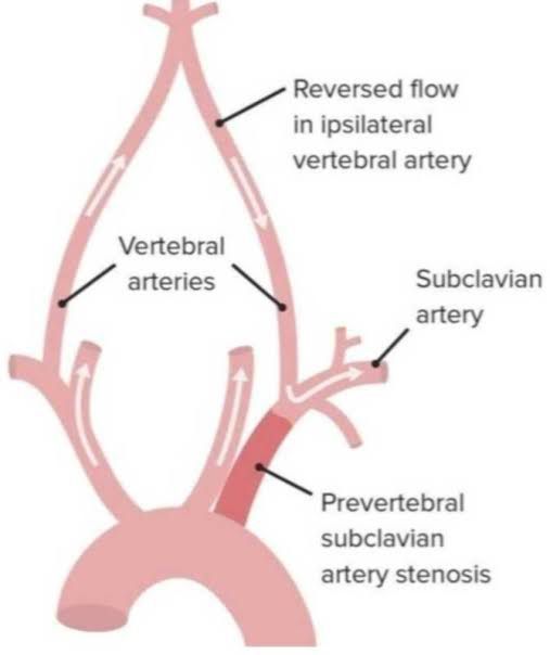 Subclavian steal syndrome (SSS), also known as subclavian-vertebral artery steal syndrome, is a phenomenon causing retrograde flow in an ipsilateral vertebral artery due to stenosis or occlusion of the subclavian artery, proximal to the origin of the vertebral artery. Subclavian steal is asymptomatic in most patients and does not warrant invasive evaluation or treatment. It can manifest in some patients with symptoms of arterial insufficiency affecting the brain or the upper extremity, supplied by the subclavian artery.