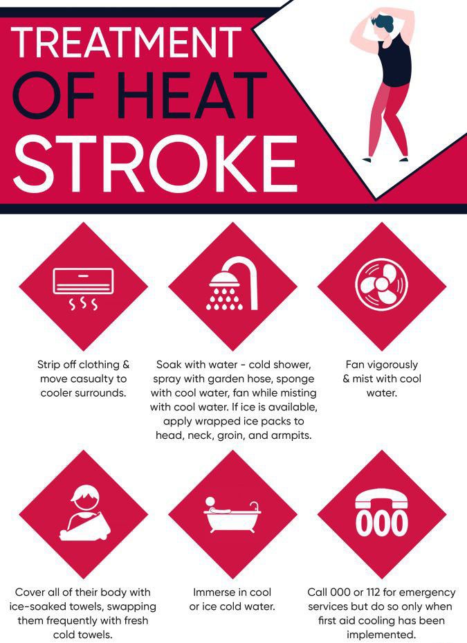Seek emergency medical care Put the person in a cool tub of water or a cool shower. Spray the person with a garden hose. Sponge the person with cool water. Fan the person while misting with cool water. Place ice packs or cool wet towels on the neck, armpits and groin. Cover the person with cool damp sheets