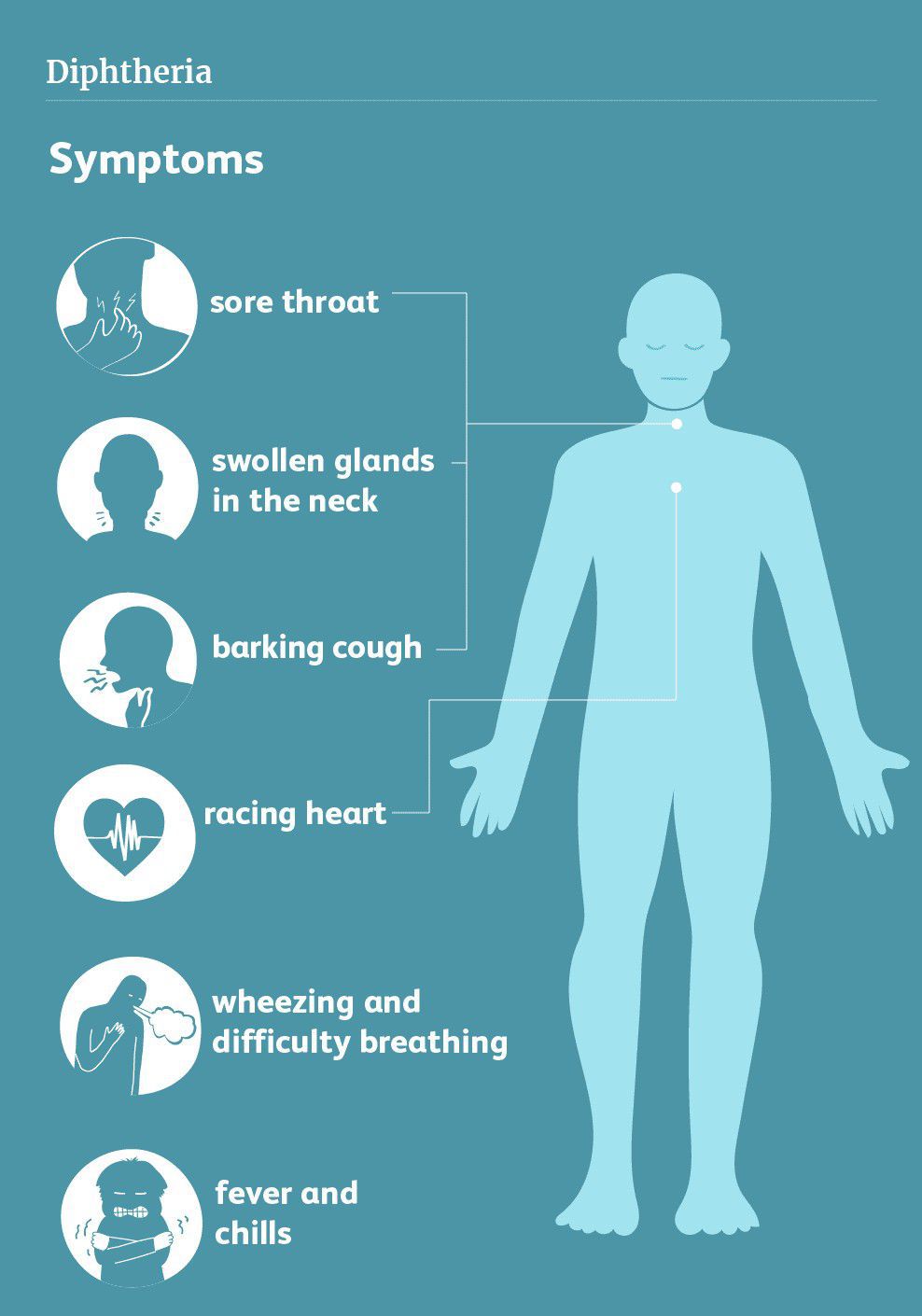 Signs and symptoms may include: A thick, gray membrane covering the throat and tonsils. A sore throat and hoarseness. Swollen glands (enlarged lymph nodes) in the neck. Difficulty breathing or rapid breathing. Nasal discharge. Fever and chills. Tiredness.