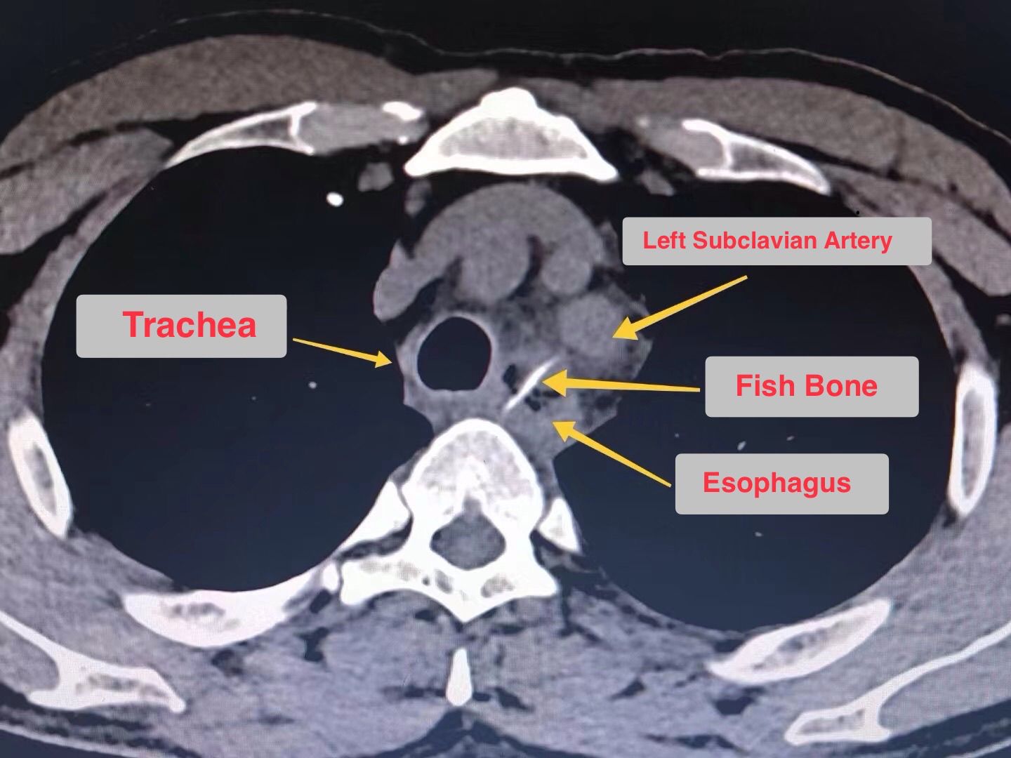 Patient presented to the emergency department with complaints of foreign body in esophagus. Upon radiological investigations and clinical history of the patient, fish bone was identified in the esophagus and was surgically removed.