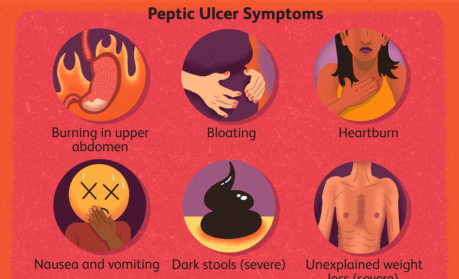 Symptoms are as follow . Burning in upper abdomen . Fainting . Dizziness . Dark or bloody red stool . Nausea or vomit . Heart burn