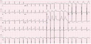Sinus arrhythmia, with antero-septal STEMI!! Probable occlusion of LAD, left anterior descending coronary artery.