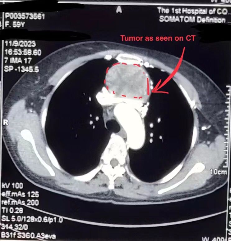 CT finding of mediastinal tumor in a 59 yrs old female.