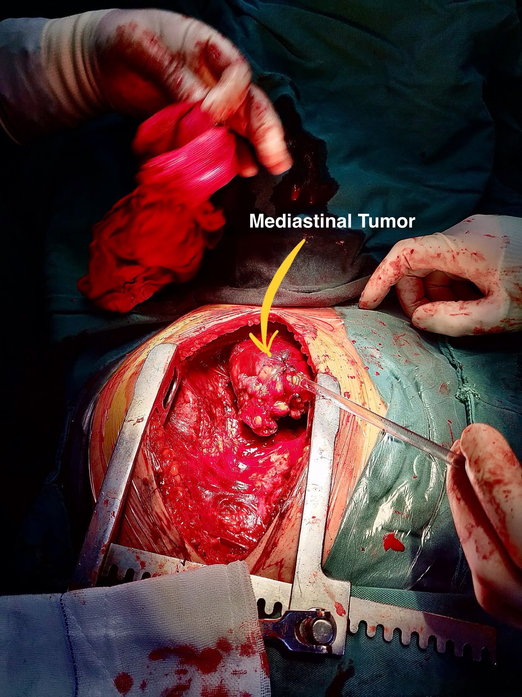 A 59-year-old female presented to the cardiothoracic department referred from ER with a radiological findings of a mediastinal tumor measuring 6.5 cm x 5.5 cm. The tumor was excised surgically via medial thoracotomy.
