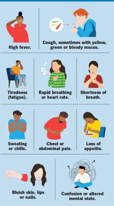 Symptoms Fever. Cough. Difficulty breathing. Chest pain. Chills. Fatigue (tiredness)