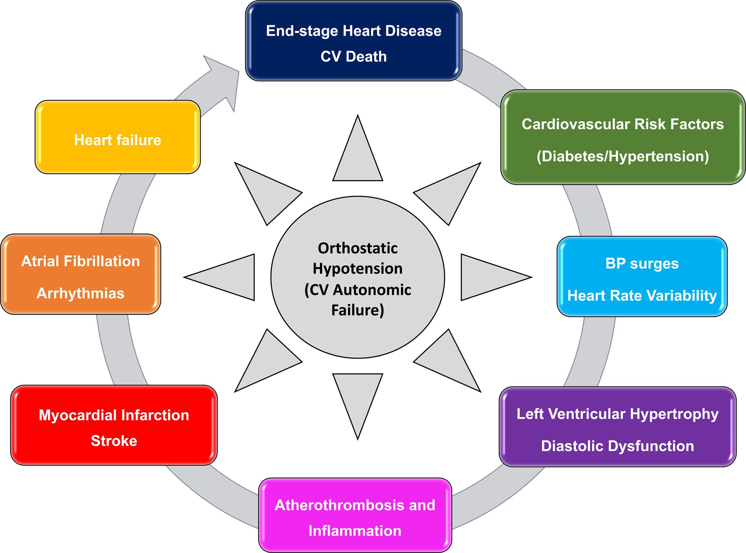 Persistent orthostatic hypotension can cause serious complications, especially in older adults. These include: Falls. Falling as a result of fainting is a common complication in people with orthostatic hypotension. Stroke. The swings in blood pressure from standing and sitting as a result of orthostatic hypotension can be a risk factor for stroke due to the reduced blood supply to the brain. Cardiovascular diseases. Orthostatic hypotension can be a risk factor for cardiovascular diseases and complications, such as chest pain, heart failure or heart rhythm problems.