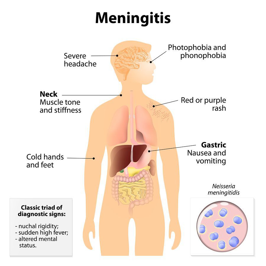 Symptoms of meningitis can be different in babies than in children and adults. In bacterial meningitis, fever, headache and neck stiffness can come on suddenly and your condition can worsen rapidly. Symptoms of meningitis in children and adults Neck stiffness. Nausea or vomiting. Sensitivity to light (photophobia). Confusion or altered mental state. Lack of energy (lethargy), extreme sleepiness or trouble waking up. Lack of appetite. Small round spots that look like a rash (petechiae). Additional symptoms of amebic meningitis You might experience additional symptoms of amebic meningitis a few days after your initial symptoms: Hallucinations. Loss of balance. Lack of attention or focus. Meningitis signs and symptoms in babies Your baby might not experience the same meningitis symptoms as adults (like headache, neck stiffness and nausea) and it can be hard to tell even if they are. Some signs of meningitis you can look for in babies include: Bulging “soft spot” (fontanelle) on baby’s head. Poor eating. Sleepiness or trouble waking up from sleep. Low energy or slower responses (lethargy).