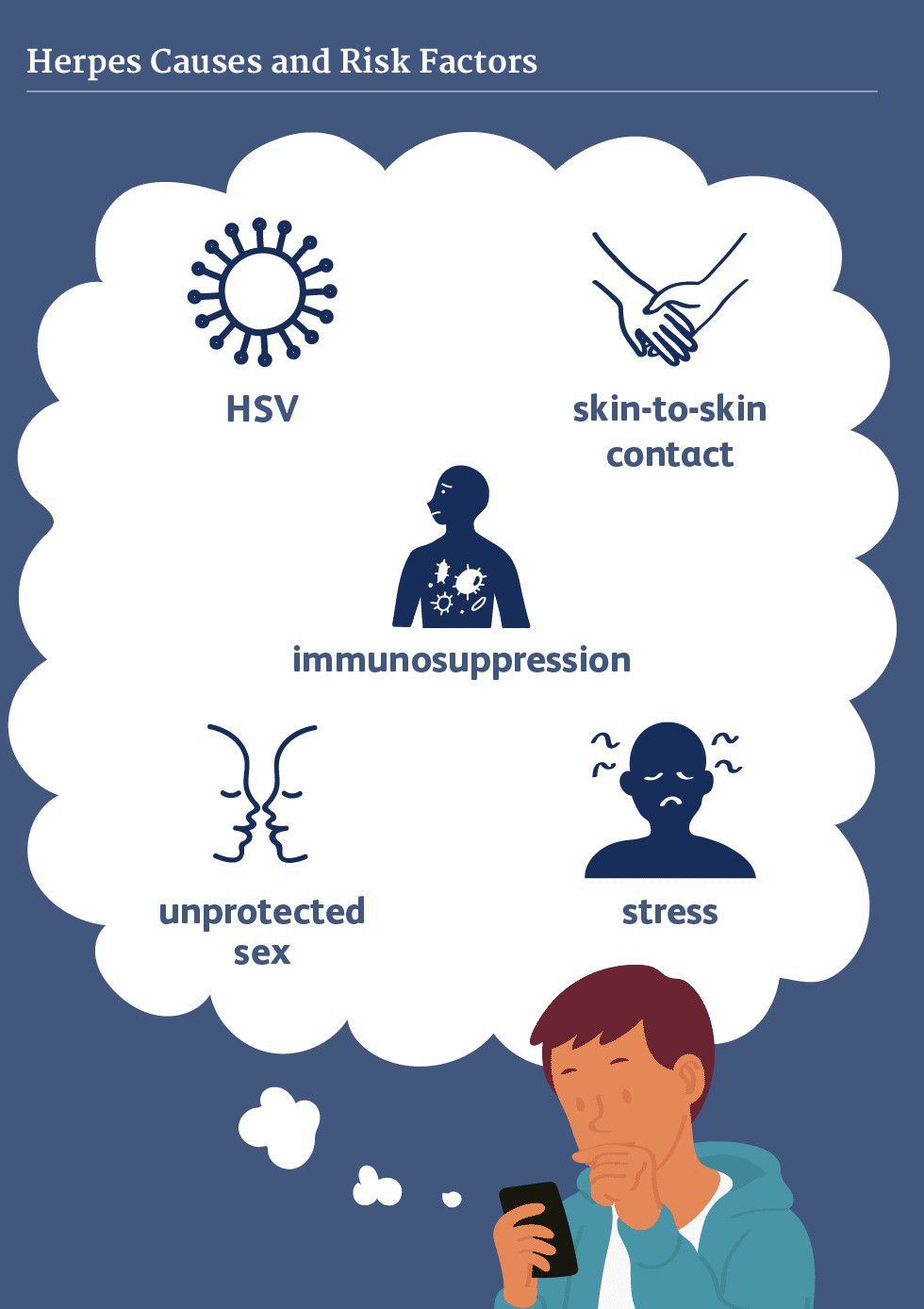 The herpes simplex virus (HSV) causes genital herpes. Genital herpes can often be spread by skin-to-skin contact during sexual activity. Some people infected with the virus may have very mild symptoms or no symptoms.
