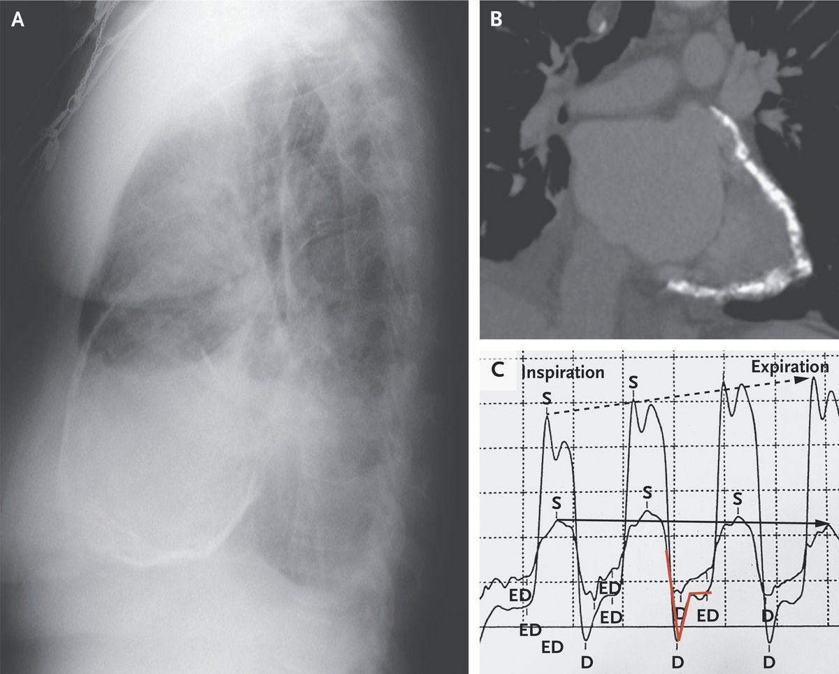 A 69-year-old woman presented to the emergency department with a 3-year history of dyspnea on exertion. She had a history of focal pleural plaques that had been attributed to asbestos exposure that occurred during her work at an insulation-manufacturing company. Physical examination was notable for signs of volume overload. A chest radiograph showed circumferential calcification of the pericardium, pleural effusions, and interstitial edema (Panel A, lateral view). Computed tomography of the chest revealed extensive pericardial calcification (Panel B). A transthoracic echocardiogram showed a preserved ejection fraction with a septal bounce in early diastole as well as expiratory diastolic reversal in the hepatic vein. A subsequent simultaneous left and right heart catheterization showed ventricular interdependence and discordance of the pressure tracings. During inspiration, when pressures in the right ventricle were at their highest, left ventricular pressures were at their lowest; this pattern reversed during expiration (Panel C; right ventricular pressure, solid arrow; left ventricular pressure, dotted arrow). A “square root” sign (also called a dip-and-plateau pattern; Panel C, red line), which represents rapid ventricular filling in early diastole before abrupt cessation in late diastole, was seen. A diagnosis of constrictive pericarditis due to asbestosis was made. A pericardiectomy was performed. Analysis of pericardial tissue was negative for tuberculosis. At 2 years of follow-up, the patient was doing well.