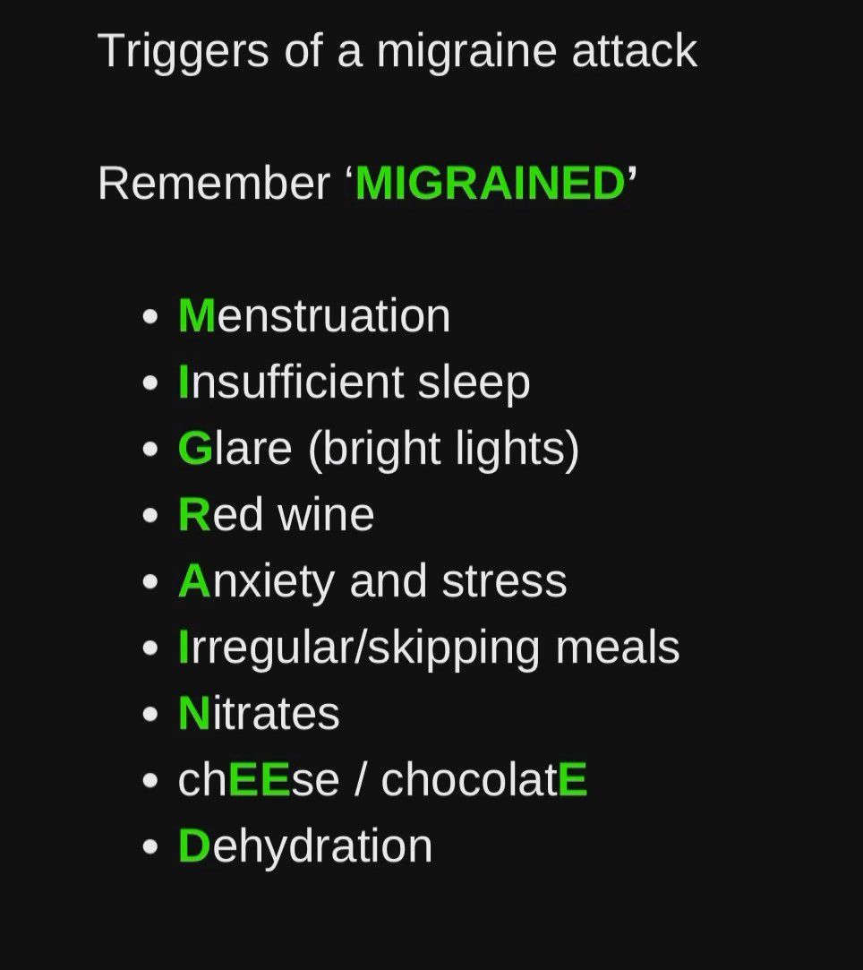 Here is a mnemonic to memorize migraine triggers.