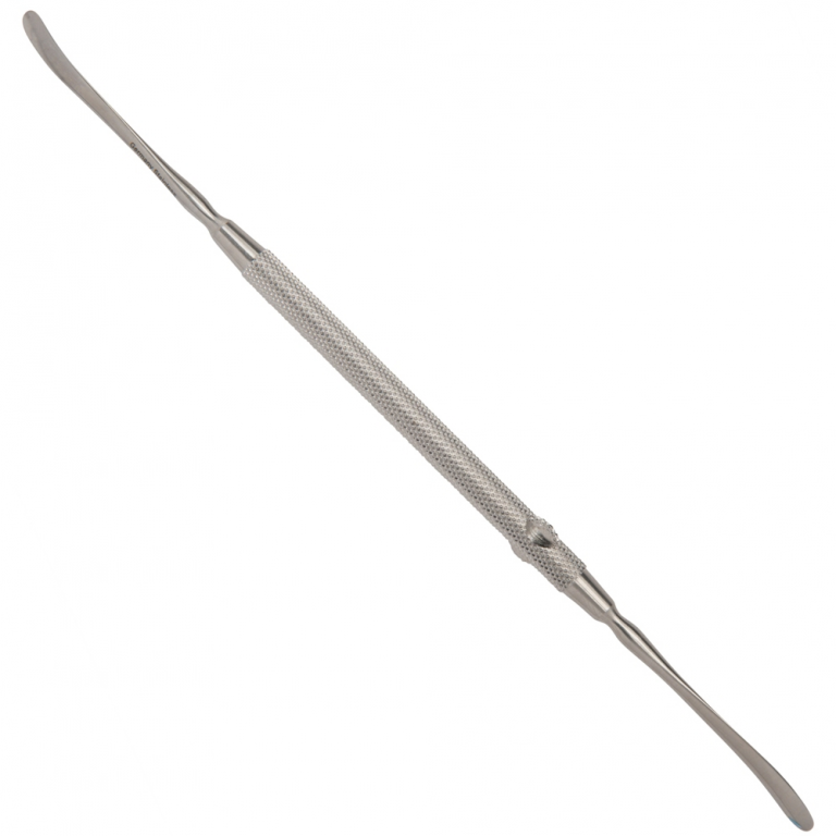 On one end, find a blunt tear-drop tip. On the other end, a sharp tear-drop tip. Which will be used most? Depends on the procedure, most commonly used for orthopedic and neurosurgical operations to debulk and lift in conjunction with other instruments in the classic stainless steel, of course.
