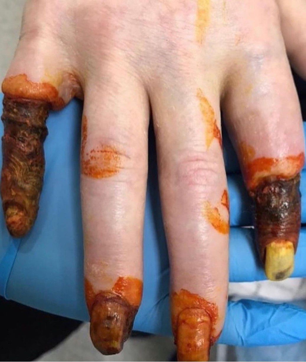 The result of an uncontrolled diabetes mellitus This photo shows gangrene of multiple fingers in a patient with type 2 diabetes and severe peripheral arterial disease. Diabetes mellitus is a risk factor for peripheral vascular disease, thus for dry gangrene, but also a risk factor for wet gangrene, particularly in patients with poorly controlled blood sugar levels, as elevated serum glucose creates a favorable environment for bacterial infection. How would you treat this medical condition? Comment your answer