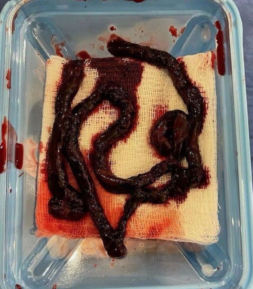 A massive 19 inch (48.26cm) long pulmonary embolism that was extracted from patient’s lungs Incredibly, this patient survived such a large embolism. Pulmonary thromboembolism is an occlusion of the pulmonary vasculature by a blood clot and is not a disease in and of itself. Rather, it is a complication of underlying venous thrombosis, usually from a thrombi that originate in the deep venous system of the lower extremities. After the thrombi dislodges, it travels through the vena cava and into the right side of the heart to the lung, large thrombi can lodge at the bifurcation of the main pulmonary artery or the lobar branches and cause hemodynamic compromise. A drop vein thrombi and subsequent thromboembolic disease is suspected in patients that have long plane rides or are bed-bound following a major surgery or can infrequently occur with upper extremity, subclavian, and internal jugular vein thrombosis, which occurs in patients when intravenous catheters are placed in the associated veins. Also, in the pregnant patient, thrombosis may occur initially in the pelvic veins rather than follow the usual course of starting in the distal and then extending to the proximal veins. present with sudden onset of dyspnea, pleuritic chest pain, hypotension, tachycardia, tachypnea, right heart failure, and syncope. In patients with massive acute embolism, either catheter embolectomy or surgical embolectomy may be considered if they have clinical evidence of an adverse prognosis (ie, new hemodynamic instability, worsening respiratory failure, severe right ventricular dysfunction, or major myocardial necrosis).