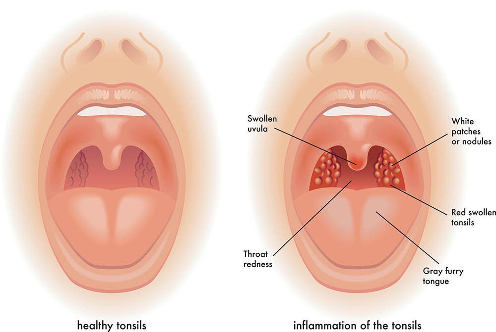 Tonsillitis is inflammation of the tonsils, two oval-shaped pads of tissue at the back of the throat — one tonsil on each side. Signs and symptoms of tonsillitis include swollen tonsils, sore throat, difficulty swallowing and tender lymph nodes on the sides of the neck.