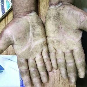 A classic presentation of Palmar hyperkeratosis. The patient told me that he has this problem by birth. And his siblings and mother also has the same presentation.