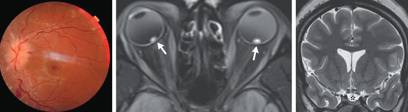 A 25-year-old woman with severe obesity presented to the emergency department with a 1-week history of blurred vision, transient visual obscurations, daily headaches, and intermittent whooshing sounds. Her body-mass index (the weight in kilograms divided by the square of the height in meters) was 57. On neurologic examination, optic-disk swelling and retinal hemorrhages were present in both eyes (Panel A, left eye). The results of visual-field and cranial-nerve testing were normal. Magnetic resonance imaging and venography of the head revealed flattened posterior globes with marked elevation of the optic-nerve heads (Panel B, arrows), an empty sella (Panel C, asterisk), and stenoses of the transverse sinuses without obstruction or thromboses — all of which were suggestive of elevated cerebrospinal fluid pressure. A lumbar puncture was notable for an elevated opening pressure of 55 cm of water (reference range, 10 to 20); the results of the cerebrospinal fluid analysis were normal. A diagnosis of idiopathic intracranial hypertension was made. Idiopathic intracranial hypertension is a disorder associated with obesity that manifests with symptoms resulting from increased intracranial pressure, including headaches, diplopia, visual field defects, and pulsatile tinnitus. Treatment with high-dose acetazolamide was started, and counseling on weight loss was provided. At a 1-month follow-up visit, the patient’s papilledema had decreased, and treatment with acetazolamide had been continued.