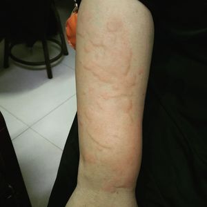 Urticaria, also known as Hives, is a type of skin rash with red, raised and itchy bumps. Usually they last for few days and do not leave any long lasting skin changes.