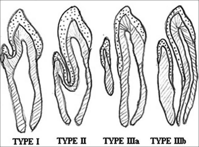Öhlers is most popular system used to classify Dens Invaginatus as follows: Type 1: Cases are those in which invaginations end as a blind sec within the crown. Type 2: The invagination extends epically beyond the cement enamel junction. Type 3: The invagination extends beyond the cement enamel junction and a second "apical foramen" is evident.