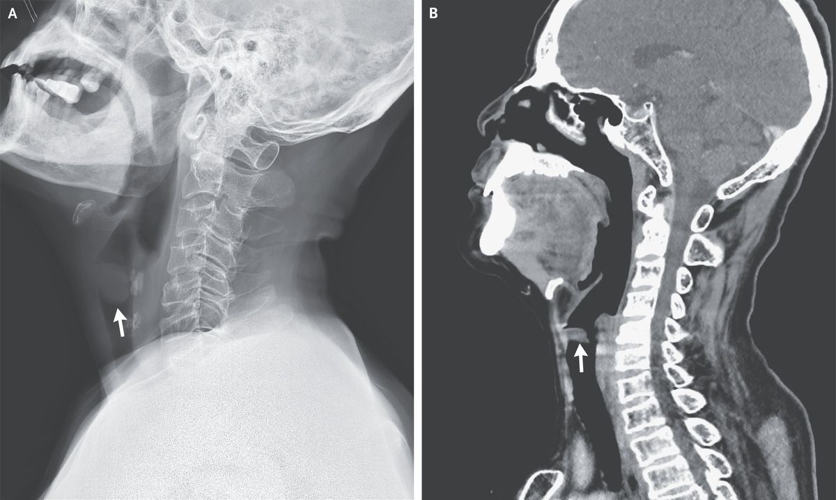A 69-year-old man presented to the emergency department with a 2-week history of progressive, intermittent dyspnea that worsened when he was lying down. He also reported a 2-year history of hoarseness and a 30-pack-year smoking history. He worked in a noisy factory and frequently yelled to communicate with coworkers. On physical examination, there were normal inspiratory breath sounds and loud expiratory wheezes that were heard best over the neck. Owing to concern for upper-airway obstruction, radiography and computed tomography of the neck were performed, both of which showed a mass causing partial obstruction of the upper airway (Panels A and B, respectively, arrows). Bronchoscopy was subsequently performed, during which a large vocal-cord polyp was found to be causing intermittent airway obstruction in a ball-valve fashion during expiration (see video). Vocal-cord polyps commonly manifest with hoarseness. Such polyps result from chronic irritation of the vocal cords, such as from smoking, reflux, or vocal strain. Immediately after bronchoscopic polypectomy, the patient’s dyspnea resolved. Histopathological analysis confirmed the lesion to be a benign vocal-cord polyp. At the 1-month follow-up, his voice had returned to normal. Counseling on smoking cessation and vocal-strain avoidance was given.