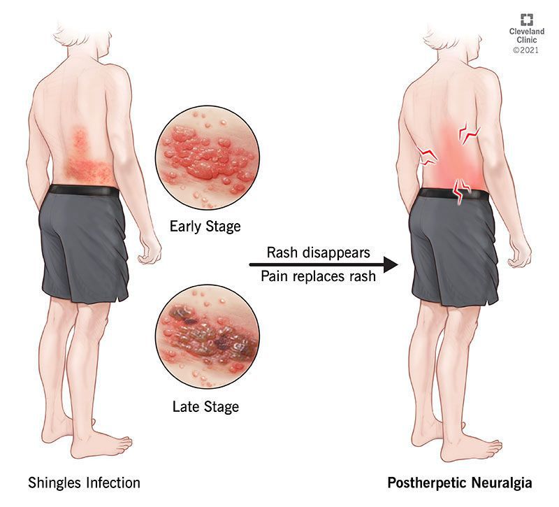 Postherpetic neuralgia (PHN) is a complication of shingles infection (also called herpes zoster). Shingles is caused by the reactivation of the varicella-zoster virus, which is the same virus that causes chickenpox. Shingles causes a painful, blistering rash and other symptoms. The rash most commonly occurs in a band pattern on one side of your body, usually on your trunk (central core of your body). The rash turns into blisters. As the rash/blisters go away, pain may remain. When pain remains, the condition is called postherpetic neuralgia.