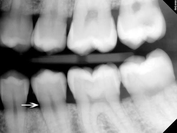 Cervical burnout appears as a radiolucent band around the necks of teeth and is more pronounced at the proximal edges. The X-ray photons overpenetrate or burn out the thinner tooth edge and create the radiolucent area that mimics cervical caries