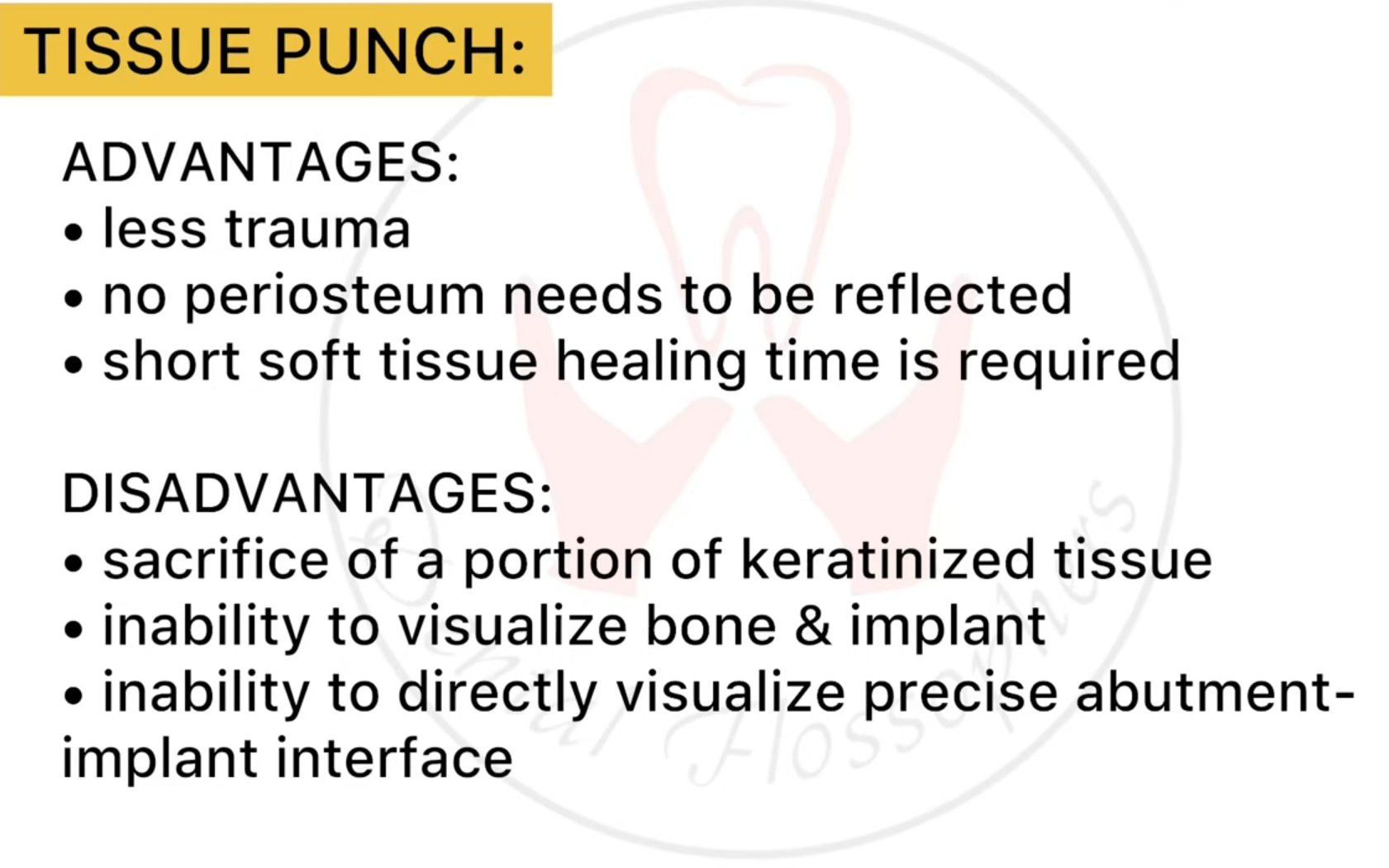 A tissue punch is a simple and easy way to gain access to the underlying bone for dental implant placement. It generally is used when there is: Excellent ridge width and there will be no bone needed i.e. mandibular posterior. Excellent keratinized gingiva.