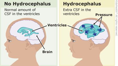 ydrocephalus is a condition characterized by an abnormal accumulation of cerebrospinal fluid (CSF) within the ventricles of the brain. CSF surrounds the brain and spinal cord. When the circulatory path of the CSF is blocked, fluid begins to accumulate, causing the ventricles to enlarge and the pressure inside the head to increase, resulting in hydrocephalus.