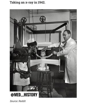 Wilhelm Rontgen is credited with the creation of the first x-ray machine, but his invention was a happy accident. Rontgen was experimenting with cathode rays and found that the rays were strong enough to pass through skin, but not strong enough to pass through denser objects, like bones, when photographed. The medical and scientific community latched onto Rontgen’s invention because it provided them, for the first time, with a way to see inside the human body without cutting it open. The baby shown in this image is getting an x-ray and he nurse is trying to get him to sit still. #doctor #doctors #nurse #medical #medicine #medstudent #medicalstudent #treatment #info #health #healthy #hospital #emergency #paramedic #study #learn #treat #surgery #patient #medschool #medicalschool