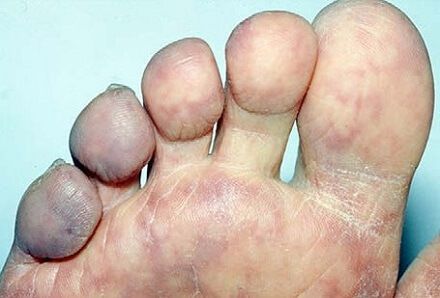 Purple toes syndrome is an extremely uncommon, nonhemorrhagic, cutaneous complication associated with warfarin therapy. It is characterized by the sudden appearance of bilateral, painful, purple lesions on the toes and sides of the feet that blanch with pressure.
