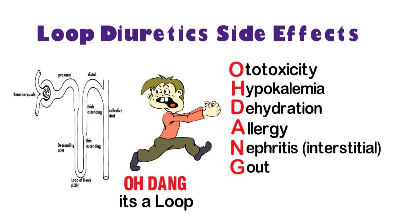 As a result, the loop diuretics are used more for the therapy of edema than long term therapy of hypertension. Common and shared side effects of the loop diuretics include dizziness, headache, gastrointestinal upset, hyponatremia, hypokalemia and dehydration