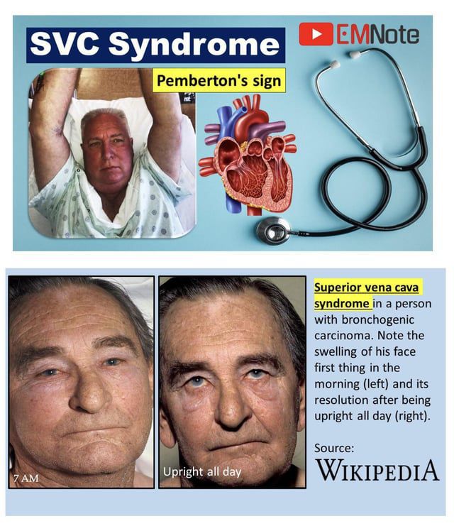 Context: Pemberton's sign is used to evaluate venous obstruction in patients with goiters. The sign is positive when bilateral arm elevation causes facial plethora. It has been attributed to a "cork effect" resulting from the thyroid obstructing the thoracic inlet, thereby increasing pressure on the venous system