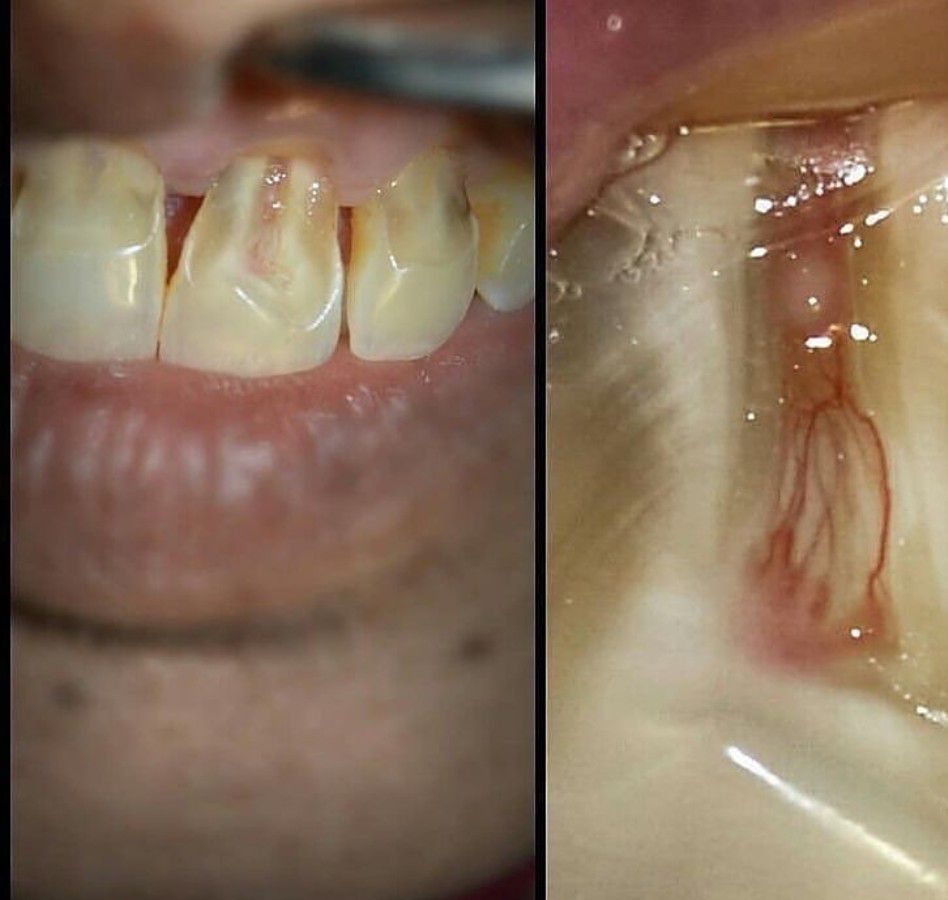 Pulp vasculature visible through an intact transparent (sclerotic) dentin.. natural defensive mechanism of pulp .