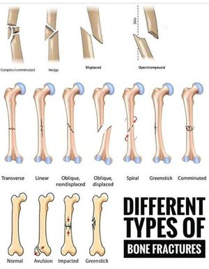 ......Bones are rigid, but they do bend or "give" somewhat when an outside force is applied. However, if the force is too great, the bones will break, just as a plastic ruler breaks when it is bent too far. The severity of a fracture usually depends on the force that caused the break. If the bone's breaking point has been exceeded only slightly, then the bone may crack rather than break all the way through. If the force is extreme, such as in an automobile crash or a gunshot, the bone may shatter. If the bone breaks in such a way that bone fragments stick out through the skin, or a wound penetrates down to the broken bone, the fracture is called an "open" fracture. This type of fracture is particularly serious because once the skin is broken, infection in both the wound and the bone can occur. Common types of fractures include: Stable fracture. The broken ends of the bone line up and are barely out of place. Open, compound fracture. The skin may be pierced by the bone or by a blow that breaks the skin at the time of the fracture. The bone may or may not be visible in the wound. Transverse fracture. This type of fracture has a horizontal fracture line. Oblique fracture. This type of fracture has an angled pattern. Comminuted fracture. In this type of fracture, the bone shatters into three or more pieces. .... Yes.