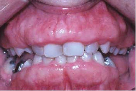 Hereditary Gingival Fibromatosis in a 37 year-old white mother. The enlarged gingiva is firm and appears normal in color and texture. The patient underwent two surgical interventions as a teenager with poor long-term results.