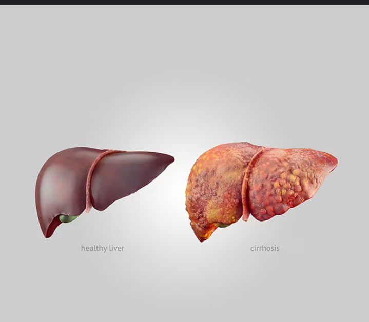 A picture to help differentiate a healthy liver from liver cirrhosis.