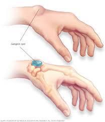 Ganglion cysts are lumps that most often appear along the tendons or joints of wrists or hands. They also can occur in ankles and feet. Ganglion cysts are typically round or oval and are filled with a jellylike fluid. They are not cancer