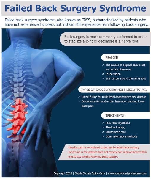 New pain at a level different from the location treated. Inability to recuperate. Restricted mobility. Sharp, stabbing back pain. Numbness or pain radiating through the lower back into the legs. Back spasms. Anxiety, depression, and sleeplessness. Potential dependence on pain medication.