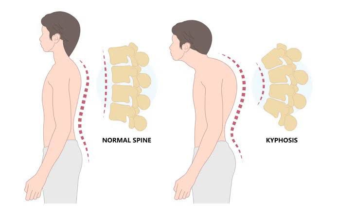 Kyphosis is an exaggerated, forward rounding of the upper back. In older people, kyphosis is often due to weakness in the spinal bones that causes them to compress or crack. Other types of kyphosis can appear in infants or teens due to malformation of the spine or wedging of the spinal bones over time.