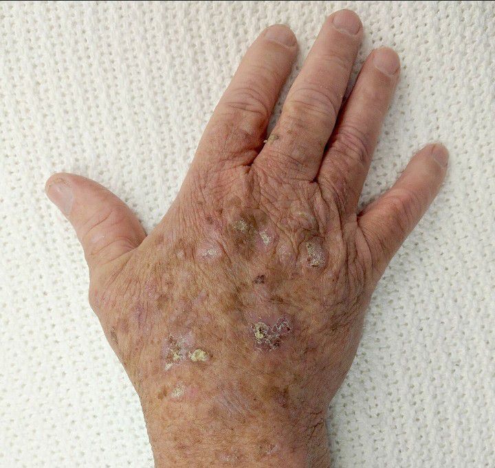 Actinic keratoses (also called solar keratoses) are dry, scaly patches of skin that have been damaged by the sun. It's not usually serious, but there's a small chance the patches could become skin cancer.