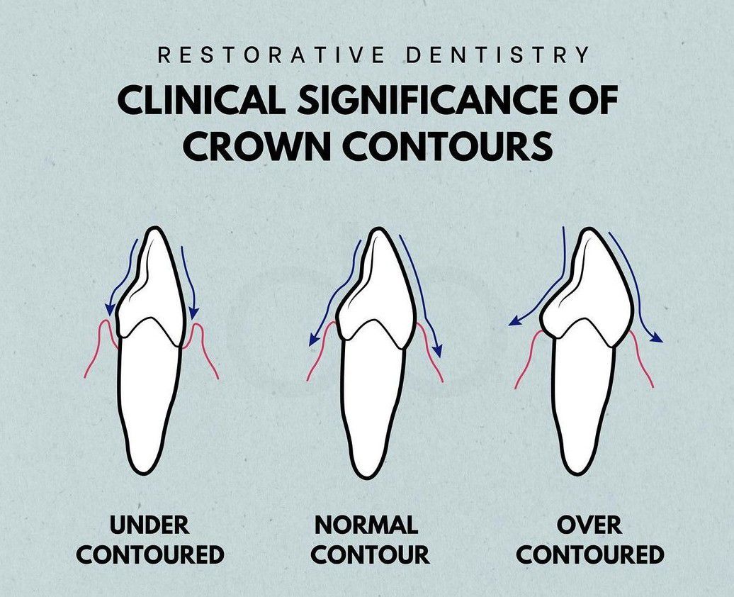 ❌ Under-Contoured: Direct impact of food on supporting tissues causing trauma to supporting structures. ✅ Normal Contour: Permits adequate stimulation and protection of supporting tissues. ❌ Over-Contoured: Deflect food from the gingiva causing poor gingival stimulation and increased plaque retention.