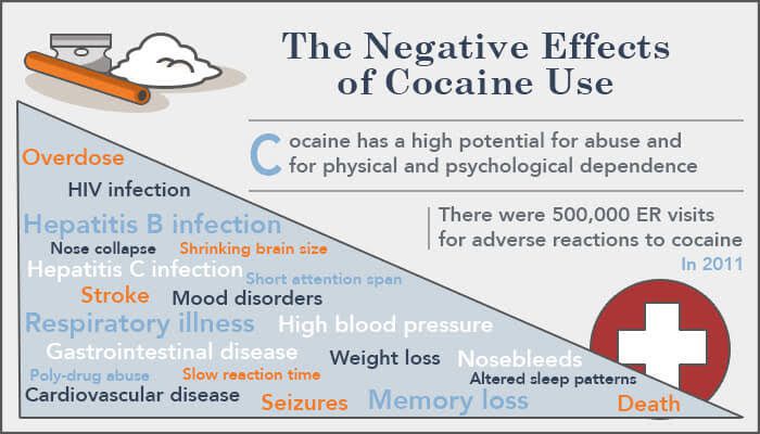 When cocaine is first used, it produces short-term effects that people may view as desirable. Cocaine side effects are often what make people want to continue using the drug and can include: Feelings of euphoria1,2 Increased energy1,2 Increased alertness1,2 Reduced need to sleep or eat2,3 Talkativeness2,3 Cocaine can also cause short-term physiological and mental changes, including: Abdominal pain2 Anxiety1,3 Dizziness2,3 Increased blood pressure, body temperature, and heart rate2,3 Increased sensitivity to sounds, sights, and touch1,2 Irritability1,2 Nausea1,2 Paranoia1,2 Restlessness1,2 Tremors2,3 Volatile or violent behavior1,2 Even if cocaine is only used once, it can cause significant and potentially fatal medical complications.2 These can include:2 Coma Heart attack Irregular heartbeat or changes to the heart rhythm Seizure Stroke