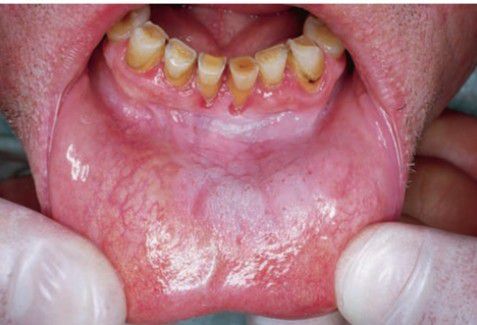 Asymptomatic white folds surrounding area where tobacco is held; usually found in labial and buccal vestibules.