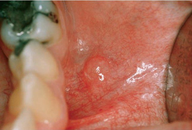 Bluish nodule (normal color if deep) usually covered by epithelium; may be slightly painful and have associated acute inflammatory reaction.