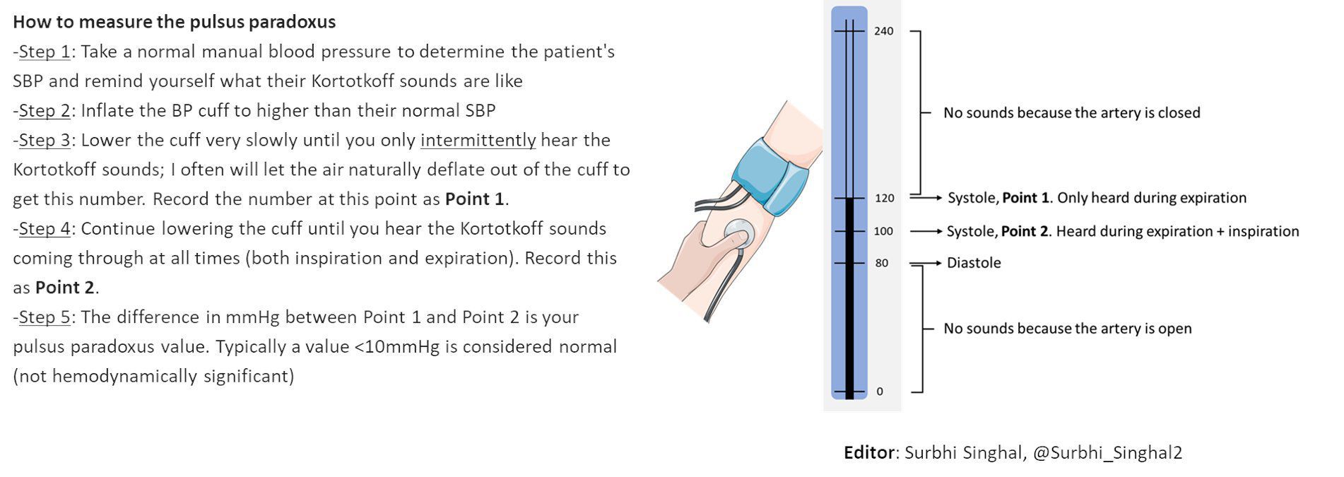 Using a manual blood pressure cuff, your healthcare provider will: Inflate the cuff until they don’t hear pulse sounds with a stethoscope or ultrasound wand. They can also use a pulse oximetry monitor to find pulse sounds. Deflate the cuff slowly (2 millimeters of mercury per second) and listen for a pulse. Check the pressure while you’re exhaling. Deflate the cuff a little more. Check the pressure again while you’re breathing in and out and your provider can hear your pulse. Figure out the difference between the two systolic (top) numbers from when you breathe in and breathe out. You could have pulsus paradoxus if the difference between the numbers is higher than 10 millimeters of mercury (mmHg). Note: Providers can use a catheter in your artery to check for pulsus paradoxus. They may use this invasive method in an intensive care setting.