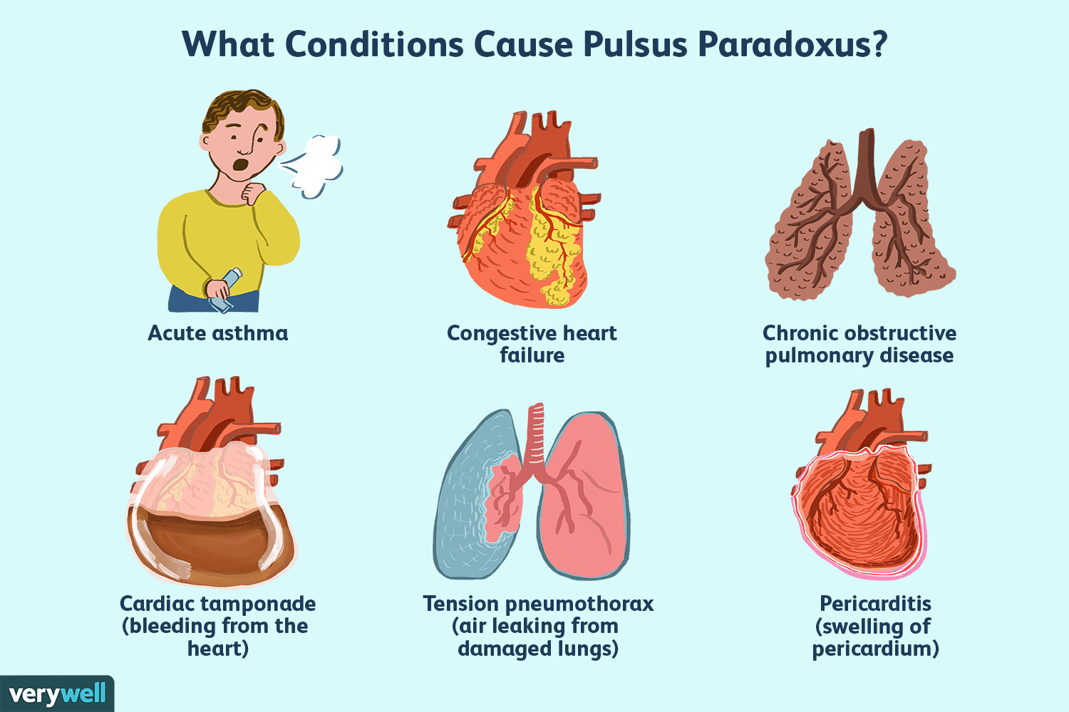 A large pericardial effusion is the most common cause of pulsus paradoxus. Normally, you have some fluid in your pericardium, or sac around your heart. This gives your heart protection and cushioning. But sometimes, too much fluid builds up in your pericardium. Providers call this pericardial effusion. This fluid buildup presses on your heart because your pericardium can only stretch so much. When the fluid buildup squeezes the heart so much that blood can’t enter, it becomes cardiac tamponade. Other pulsus paradoxus causes include: Constrictive pericarditis. The sac around your heart (pericardium) stiffens and thickens. Pleural effusion. This is excess fluid around your lungs. Restrictive cardiomyopathy. Muscles in two of your heart’s four chambers get stiff. Asthma. Mucus blocks your narrowed airways. Tricuspid atresia. People with this condition are born without a tricuspid valve in their hearts. Pneumothorax (collapsed lung). Air gets outside your lung and presses against it. Thoracic outlet syndrome. These are compressed blood vessels in your upper chest. Chronic obstructive pulmonary disease (COPD). These are diseases that damage your lungs. Pectus excavatum. This is a congenital (since birth) issue in which your breastbone grows inward, creating a sunken chest wall. Other things that compress your heart, such as surgery or having a body mass index (BMI) greater than 30 (having obesity). In causes that don’t involve your pericardium, both blood pressure numbers (top and bottom) usually fall.