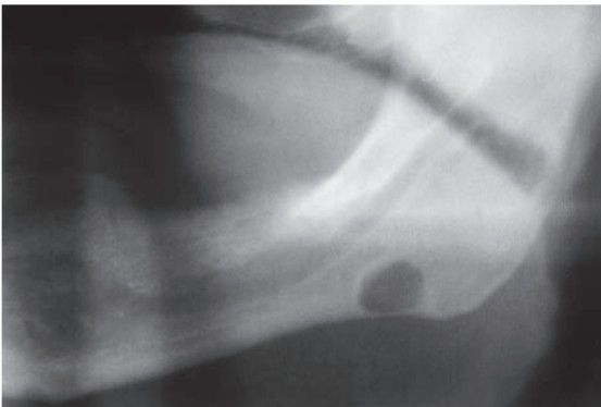 Represents lingual depression of mandible; filled with salivary gland or other soft tissue from floor of mouth; asymptomatic; an incidental finding that requires no biopsy or treatment.