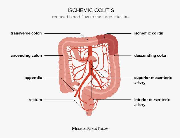 Ischemic colitis occurs when blood flow to part of the large intestine is temporarily reduced. This segment of the large intestine is called the colon. This reduced blood flow may be caused by narrowing of the blood vessels supplying the colon. It also may be due to reduced blood flow caused by low blood pressure.