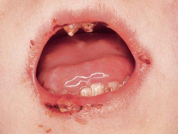 Epidermolysis bullosa in a child. Note ulcers, constricted opening, and atrophic tongue mucosa.