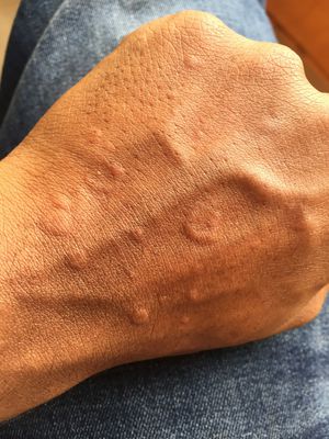 22 yr male pt b/b self for his medical condition, pt got ths rashes with the round shape at all over the body , it make vry irritation, itching, burning sensation !!! Subsides by 2-3 hrs .